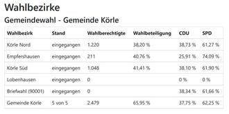 Bei der Wahl des Kreistages gingen aus Körle 39,38 Prozent der Stimmen an die SPD. Die CDU erhielt 22,55 Prozent und landete damit auf Platz 2 vor der AfD (15,18 Prozent). Die Wahlbeteiligung liegt bei rund 66 Prozent.