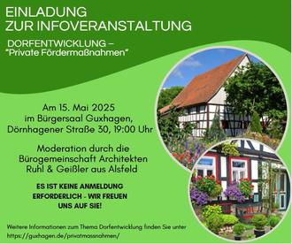 Zur Information über die Umsetzung erster Projekte sowie insbesondere das Thema „private Fördermaßnahmen“ lädt die Gemeinde Guxhagen interessierte Bürgerinnen und Bürger herzlich zu der Infoveranstaltung „Dorfentwicklung – Private Fördermaßnahmen“ ein. Die Veranstaltung findet am 15. Mai 2025 um 19 Uhr im Bürgersaal Guxhagen, Dörnhagener Straße 30 statt.