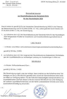 Die nach § 103 Abs. 2 und § 105 Abs. 2 HGO erforderlichen Genehmigungen der Aufsichtsbehörde zu den Festsetzungen in den §§ 2 und 4 der Haushaltssatzung sind erteilt. Sie haben folgenden Wortlaut: