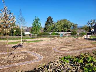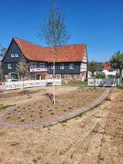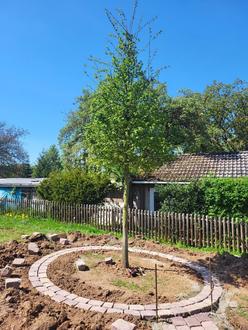 Inzwischen ist viel geschehen. Die Umgestaltung der großen Fläche links neben der Winterkirche wurde im Herbst 2024 begonnen. Die Flächen der 5 Bauminseln sowie der Gehölzsaum an der westlichen Friedhofsgrenze wurden anhand der Vorgaben des Büros PLANRAT VENNE durch den gemeindeeigenen Bauhof angelegt. Die Einfassungen bestehen aus einem 2-reihigen Natursteinpflaster welches farblich so gewählt wurde, dass es sich gut in die Umgebung einfügt. Etliche Kubikmeter Erde wurden auf der Fläche bewegt.
