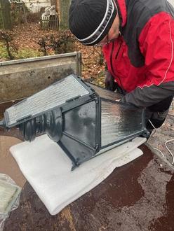 Am Lampenkopf wurden einige Metallarbeiten durchgeführt und im weiteren Verlauf wurde die komplette Laterne gestrahlt und neu lackiert. Ein großer Dank geht an die Firma Kapler, Sandstrahlbetrieb in Kaufungen und die Firma FST, Schweiß- und Drehtechnik in Fuldabrück, die uns bei diesem Vorhaben sehr kompetent unterstützt haben.