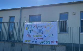Gemeinsam mit den Kindern haben wir überlegt, was wir dagegen tun können. Wir gehen regelmäßig Müll sammeln und haben uns entschieden, ein Banner zu gestalten, der nun an unserem Kita Zaun am Parkplatz hängt (gut sichtbar auch von der B83). Gemeinsam haben wir uns für den Spruch „Müll gehört in die Mülltonne und nicht vor unsere Kita“ entschieden. Wir hoffen, dass sich die Situation nun endlich verbessert.