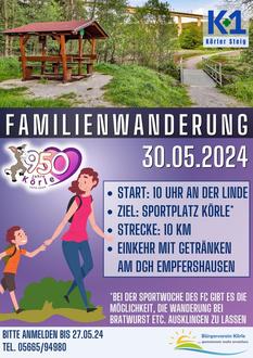 Eine abwechslungsreiche Strecke durch die nordhessische Mittelgebirgslandschaft mit herrlichen Ausblicken und gemütlichen Rastplätzen – der Körler Steig bietet Wanderern jede Menge wunderschöne Natur. Der Bürgerverein bietet im Rahmen der Veranstaltungsreihe “950 Jahre Körle” eine Familienwanderung an. Diese findet am 30. Mai (Fronleichnam), ab 10 Uhr statt. Die Teilnehmer treffen sich am Lindenplatz in Körle (Nürnberger Str./Hilgenweg) und bestreiten dann zusammen eine Strecke von etwa zehn Kilometern. Entlang des Körler Steigs geht es nach Empfershausen, wo am Dorfgemeinschaftshaus warme und kalte Getränke auf die Wanderer warten. Der Rückweg führt die Teilnehmer zum Sportplatz nach Körle, wo die Sportwoche des FC Körle stattfindet. Dort besteht die Möglichkeit, sich beispielsweise mit Leckerem vom Grill zu stärken und die Wanderung gesellig ausklingen zu lassen. Für die Wanderung sollte Rucksackverpflegung mitgebracht werden.