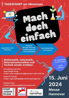 Sie ist Europas größtes Jugendevent für Naturwissenschaften und Technik – die Ideen Expo in Hannover. Die Jugendförderung Schwalm-Eder und die Jugendpflegen aus Borken (Hessen) und Guxhagen bieten allen Schülerinnen und Schülern ab der 8. Klasse am 15. Juni die Gelegenheit, dieses Event hautnah vor Ort zu erleben.