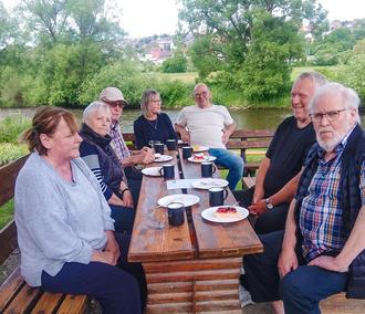Die erste „Kuchen-für-kleine-Riesen-Aktion“ fand relativ spontan und ohne langfristige Ankündigung statt – erst am Veranstaltungstag verteilte der Ortsvorsteher noch ein paar Flyer im Ort. Etwa 15 Personen kamen – plus Radfahrer, die die Aktion beim Vorbeifahren zufällig entdeckten. „Fürs erste Mal bin ich sehr zufrieden“, sagt Günter Freudenstein. Vier Kuchen hatte er vorbereitet – darunter leckerer Rhabarber-Streusel-Kuchen und Schwarzwälder-Kirsch. Den ließen ich die Gäste sowohl in der Radscheune als auch an der Sitzgruppe am Fulda-Ufer schmecken.
