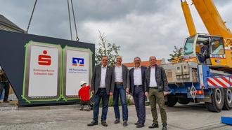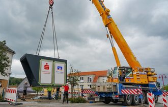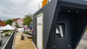Bald wird es am Dorfplatz wieder die Möglichkeit geben, Geld am Automaten abzuheben. Die Kreissparkasse und die VR PartnerBank haben jetzt einen gemeinsamen Geldautomaten-Pavillon aufgestellt, nachdem die Automaten in der Filiale im Wohn- und Geschäftshaus am Dorfplatz seit Herbst vergangenen Jahres nicht mehr befüllt worden waren. Die Banken hatten die Automaten aus Sicherheitsgründen außer Betrieb genommen, da sich die Anzahl der Geldautomaten-Sprengungen in der Region vervielfacht hatte. Allein in den vergangenen acht Jahren verzeichneten VR PartnerBank und die Kreissparkasse Schwalm-Eder acht Geldautomaten-Sprengungen, summierten Stefan Kördel (Vorstand VR PartnerBank) und Michael von Bredow (Vorstand KSK). Die 17-Tonnen-Stahlbeton-Pavillons böten alleine schon durch das massive Gewicht eine höhere Sicherheit vor Sprengungen. Hinzu kämen spezielle Sicherheitsvorrichtungen sowie ein Rolltor, das um 23 Uhr automatisch herunterfährt.