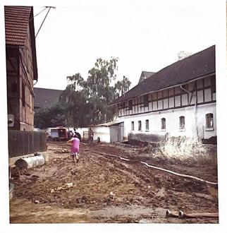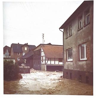 Mit einem 1,30 m hohen Wasserstand wälzten sich die Wasserfluten der Trockenen Mülmisch durch die Ecke über die Bundesstraße hinweg in das untere Dorf. Der Bachweg glich einem wildaufschäumenden tobenden Flusse zur Schneeschmelze. Die Wassermassen vom Busch und vom Kirchplatze suchten in breiter Form ihren Weg durch die Kuhgasse.