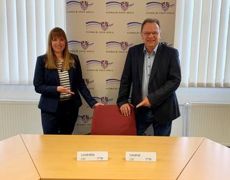Foto: Lena Schandor (Koordinatorin Schwalm-Eder-Kreis Landesprogramm „Präventionsketten Hessen“) und Landrat Winfried Becker freuen sich auf das Projekt und viele interessierte Schulklassen, die sich für das Auswahlverfahren anmelden. (Bildautor: Stephan Bürger | Kreisverwaltung Schwalm-Eder)