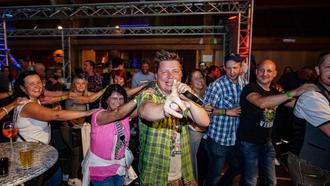 Gleichzeitig füllte sich die Berglandhalle mit den Besuchern des Dorfrocker-Konzerts. Dafür reiste nicht nur eine ganze Truppe aus der Partnergemeinde Floh-Seligenthal an, sondern sogar Konzertbesucher Nahe der Deutsch-Österreichischen Grenze. Die Musikgruppe aus Bayern stand keine fünf Minuten auf der Bühne, da brodelte auch schon die Stimmung in der Halle. Die „Spaghetti-Polonaise“ zog sich mehrfach durch die Berglandhalle und Gisela Schneider aus Empfershausen wurde von Frontsänger Tobias Thomann gleich zweimal auf die Bühne geholt. Nicht ohne Grund: Denn schließlich heißt der neue Song der Musiker „Gisela“ - und die hatte sichtlich Spaß, ihre Hymne gemeinsam mit 900 Gästen in der Halle auf der Bühne mitzusingen. Dafür gab’s von den Dorfrockern auch ein Gisela-Lebkuchenherz. „Dass ich gleich zweimal mit den Dorfrockern auf der Bühne stehe, hätte ich mir gestern Morgen auch nicht träumen lassen“, sagte Gisela Schneider am nächsten Tag und lachte. Nach den Dorfrockern sorgte DJ René M. Bieler für weitere Partystimmung.
