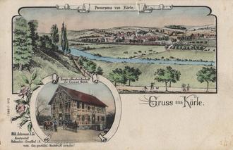 Diese Ansichtskarte von 1905 zeigt die Logir- und Gastwirtschaft von Conrad Zülch und ein Landschaftsgemälde von Körle. Zu erkennen ist der Bahnhof, der damals noch am Rand des Dorfes lag. Erst später erfolgte eine Bebauung im südlichen Bereich.