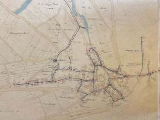 Dies ist der Plan der ersten Wasserleitungen. Fließendes Wasser und Strom waren zu dieser Zeit im Dorf noch nicht verfügbar. Wasser holte man aus dem Bach oder den wenigen Brunnen. Nachdem man in 1904 das Gebiet in den Bachweisen am Bonnrod für die Quellfassung ausgewählt hatte, begannen in 1905 die Arbeiten in schon in 1906 floss erstmals Wasser aus der neuen Leitung ins Dorf, womit auch erstmals Hydranten für die Brandbekämpfung nutzbar waren. Wie könnte es anders sein, gab es zu Anfang Streit um den Wasserpreis. Da Wasseruhren noch nicht zur Verfügung standen, wurde pro Person, Pferd, Rindvieh, Schwein oder Ziege bezahlt. Die Gaststätten zahlten eine jährliche Pauschale. Die Planung war für 700 Bewohner, 60 Pferde, 320 Stück Rindvieh und 670 Stück Kleinvieh ausgelegt.