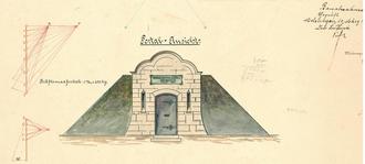 Darstellung des ersten Hochbehälters für die öffentliche Wasserversorgung. Dieses Bauwerk stand in der Straße "Zum Rot" (oberhalb von Zech).