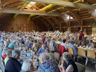 Der Musikzug Malsfeld eröffnete den Kreisseniorennachmittag mit dem Stück „Hessenland du bist mein Heimatland“ und begrüßte damit die rund 450 Gäste, die an diesem Samstag in die Vierbuchenhalle nach Röhrenfurth gekommen waren. Für den Schwalm-Eder-Kreis sprach Vize-Landrat Jürgen Kaufmann von einer schönen Tradition, die Seniorinnen und Senioren ab 80 Jahre und die Goldenen, Diamantenen und Eisernen Hochzeitspaare aus Felsberg, Melsungen, Körle, Malsfeld, Spangenberg und Morschen einmal pro Jahr einladen zu dürfen. Für das Programm ist jedes Jahr eine andere Kommune zuständig. Diese Aufgabe fiel am Samstag Malsfeld zu, daher führte Bürgermeister Michael Hanke durch ein dreistündiges und abwechslungsreiches Programm. Kaffee, Kuchen und belegte Brote wurden von den Landfrauen Malsfeld und dem DRK Körle/Guxhagen gereicht. Zuvor gab es eine Kurzandacht des Malsfelder Pfarrers Henning Reinhard. Geehrt wurden an diesem Nachmittag wieder die ältesten Teilnehmer: Bei den Damen war dies Frau Anna Reimann aus Spangenberg, die auf ein stolzen Alter von 101 Jahren zurückblicken kann. Sehr gut gehalten hat sich Gerhard Heinemann aus Röhrenfurth, der mit 95 Jahren der älteste männliche Teilnehmer war. Erfreulich war auch, dass Lisa Weingarten aus Empfershausen mit dabei sein konnte. Sie ist mit 99 Jahren die älteste Teilnehmerin aus der Gemeinde Körle.