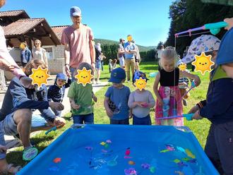 Außerdem durfte auch in diesem Jahr unser großes Sommerfest nicht fehlen. Wir haben uns alle gemeinsam auf dem Grillplatz in Empfershausen getroffen und dort einen schönen Vormittag verbracht. Es gab viele Stationen zum Spielen für die Kinder, leckere Bratwürstchen und ein großes Buffet. Besonders beliebt war die Station mit einer Pumpe und einem Wasserschlauch, mit dem die Kinder nach kräftigem Pumpen Bälle von Pylonen herunter spritzen konnten. Auch eine Schatzsuche im Sandkasten hat stattgefunden und es wurden viele Enten und Fische aus einem Planschbecken geangelt. Vielen Dank an den Elternbeirat für die tolle Organisation und auch an alle Familien für die Beteiligung an dem Buffet. Es war ein schöner sonniger Tag mit einem netten Beisammensein und auch einige ehemalige Pusteblümchen-Kinder konnten wir mal wieder sehen.