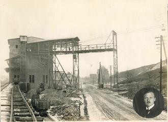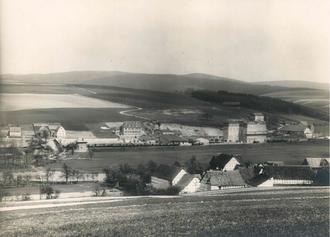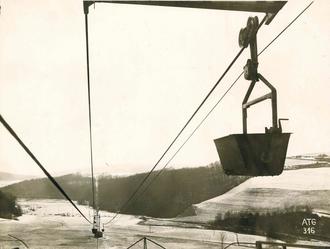 Für eine größere Transportkapazität baute man in 1924 eine Seilbahn zwischen dem Basaltabbaugebiet am grünen See und dem Werk in Körle. Diese hatte eine Länge von 3,5 km. Als der Steinbruch zum Ölberg verlagert wurde, verlängerte man die Seilbahn auf 8 km Länge. Diese Aufnahme stammt aus dem Tal der Tr. Mülmisch, etwa in Höhe der heutigen Schnellbahnbrücke.