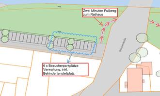 aufgrund der Anbau- Umbaumaßnahmen des Rathauses bzw. Feuerwehrgebäudes sind die Parkplätze am Gebäude nicht mehr nutzbar. Bitte parken Sie ab Montag, den 07.07.25 auf der anderen Brückenseite (Grafik).