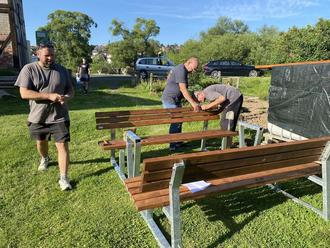 Die Bank wurde als Bausatz geliefert und von Lars Ullrich, Günter Freudenstein und Karl Ploch montiert