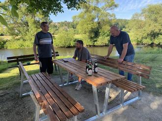 Der Rastplatz am Fuldaufer von Lobenhausen ist bei Radfahrern, Gästen und Einheimischen gleichermaßen beliebt. Seit Aufbau der Liegebänke und Eröffnung der Radscheune zur 900 Jahrfeier von Lobenhausen in 2023 ist der Platz fast ein touristischer Hotspot am Fuldaradweg geworden. Für die etwas in die Jahre gekommenen Holzbänke unter dem Walnussbaum konnte nun der Bürgerverein Ersatz bieten. Eine neue Sitzgruppe eines Herstellers aus Spangenberg bauten Karl Ploch, Lars Ullrich, Günter Freudenstein und Mario Gerhold im Juni auf und transportierten die bisher dort vorhandenen Holzbänke mit Hilfe von Bauhofleiter Mirco Hofmann zum neuen Aufstellort an den Wiesenweg auf Körler Seite, wo schon eine andere baugleiche Bank vorhanden ist. Die Anschaffung der neuen Lobenhäuser Sitzgruppe war dem Bürgerverein möglich dank einer Spende von Manfred Rycyk aus Körle, dem der Bürgerverein hiermit herzlichen Dank sagt.