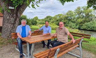 Manfred Rycyk, Mario Gerhold und Günter Freudenstein probieren die neue Sitzgruppe