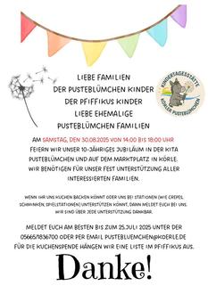 Doch bevor wir uns in unsere Kita-Sommerschließzeit verabschieden, möchten wir Sie hiermit bereits herzlich zu unserer „10 Jahre Körler Pusteblümchen“ Jubiläumsfeier am 30.08.2025 von 14:00 – 18:00 Uhr auf dem Marktplatz in Körle und einladen!