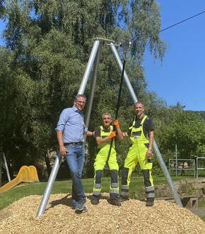 Joachim Gerlach vom Gemeindebauamt sowie Albert Tara und Mirco Hofmann vom Bauhof testen die neue Seilbahn