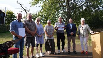 Zur Preisverleihung in Hüttenberg Volpertshausen (Lahn-Dill-Kreis) war vergangenen Freitag eine kleine Abordnung mit Ortsvorsteher Günter Freudenstein und Bürgermeister Mario Gerhold mit dem Bürgerbus angereist. Christian Zuckermann, Kreisbeigeordneter aus dem Landkreis Gießen, übergab Günter Freudenstein die Urkunde und lobte insbesondere das Konzept der Radscheune am Fulda-Ufer. „Man hat dort einen Ort der Begegnung geschaffen, der seinesgleichen sucht.“ Durch den Ausbau der alten Scheune habe Lobenhausen die touristische Entwicklung massiv vorangetrieben – und dies sei gerade heutzutage von großer Bedeutung, so Christian Zuckermann.
