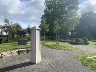 Die zentrale Stele wurde Ende August von einem Steinmetzbetrieb gesetzt. Hier werden durch die Friedhofsverwaltung demnächst Tafeln angebracht, auf denen die Namen der im Wildblumenfeld beigesetzten Personen zu lesen sein werden.