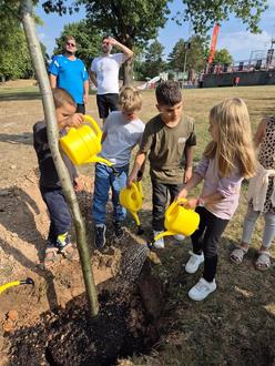 Am Mittwoch waren die Erstklässler eingeladen, um gemeinsam den Baum des Jahres 2025, eine Amerikanische Roteiche, im Freibad zu pflanzen. Begleitet wurden sie von Bürgermeisterin Susanne Schneider, Tanja Engelhardt-Krok vom Bauamt, der Rektorin der Grundschule Frau Schott und den beiden Klassenlehrerinnen, Frau Szauter und Frau Schulze.