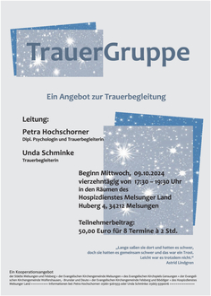 Unter der Überschrift: „Mit dem Verlust leben lernen“ trifft sich die feste Gruppe vierzehntägig mittwochs an 8 Abenden von 17:30 – 19:30 Uhr in den Räumen des Hospizdienstes Melsunger Land.