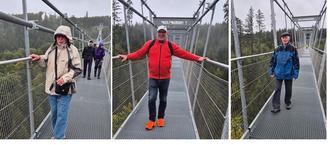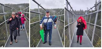 Richtig spannend wurde es bei denen, die sich für den Besuch des Sky Walks und der Skisprungschanze entschieden hatten. Mit dem Bus ging’s für die Gruppe in den Ortsteil Stryck, von wo aus eine Standseilbahn die Teilnehmer ganz bequem bis zur längsten Hängebrücke Deutschlands brachte. Obwohl dort oben Wind und Regen aus allen Richtungen kamen, ließen es sich die mutigen Seniorinnen und Senioren nicht nehmen, die Brücke Schritt für Schritt zu passieren. “Ich hatte vorher nicht geglaubt, dass meine Frau und ich die Brücke überqueren”, sagte beispielsweise Hermann Pawlik danach. “Ein tolles Erlebnis”, sagte auch Gisela Schneider, als sie mit Ehemann Horst auf der anderen Seite der Brücke ankam. Einziger Wermutstropfen: Die Aussicht von der 100 Meter hohen Brücke war wegen des äußerst regnerischen Wetters alles andere als postkartentauglich.