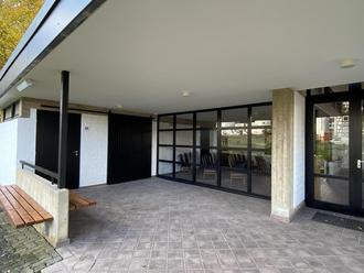 Die Friedhofshalle wurde 1971/72 nach einer Planung des damaligen Bürermeisters Fritz Ochs gebaut. Das Bauwerk entstand damals auf Betonpfeilen auf der Parzelle des angrenzenden Hainsgrabens. Ein Standort, der sich noch als zukunftsweisend herausstellen sollte, denn mit der Erweiterung des Friedhofs in Richtung Birkenweg in den 1990er Jahren erfüllte das Bauwerk zugleich die Funktion einer Verbindung zwischen dem alten und neuen Friedhofsteil. Eine Sanierung war nun nach über 50 Jahren fällig, zumal im Dachraum Marder für Schaden gesorgt hatten und alles in allem in die Jahre gekommen war.