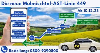 Ab 10. Dezember gibt es eine neue Verbindung durchs Mülmischtal. Per Anruf-Sammeltaxi kommt man dann mit der Linie 449 von Körle über Empfershausen bis nach Eiterhagen bzw. umgekehrt. In Körle hat man Anschluss an die RT5, in Eiterhagen kann man mit dem Bus 38 weiter in Richtung Kassel fahren sowie mit einem weiteren AST-Taxi (209.1) nach Hessisch Lichtenau.