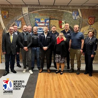 von links: Landrat Winfried Becker, Dr. Hartmut Lotz - Ärztlicher Leiter Rettungsdienst, Thomas Schröder - Leitender Notarzrt (LNA), Uwe Wunsch - stellv. Fachbereichsleiter Brand-, Katastrophenschutz u. Rettungswesen, Pascal Steil - Organisatorsicher Leiter Rettungsdienst (OLRD), Constatntin Mühr - OLRD, Marius Damm - OLRD, Kathrin Häfele - LNA, Helge Stuhlmann - OLRD, Benjamin Reitz - OLRD, Tanja Dittmar - Kreisbrandinspektorin