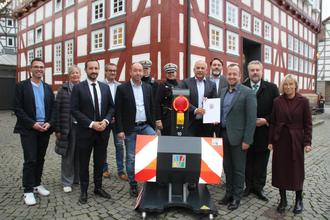 „Ich wünsche Ihnen einen schönen Weihnachtsmarkt, bei dem die Menschen friedlich und fröhlich zusammenkommen.“ Das betonte Hessens Innenminister Dr Roman Poseck, als er im Melsunger Rathaus den Bürgermeistern Timo Riedemann und Mario Gerhold einen Bewilligungsbescheid des Landes Hessen über 50.000 Euro überreichte. Es ist Geld aus dem Sofortprogramm „Sicherheit bei Veranstaltungen“ für die „Förderung der interkommunalen Zusammenarbeit“. Melsungen und Körle schaffen gemeinsam Fahrzeugsperren zur Sicherung von Veranstaltungen an. Körle gehört seit 20 Jahren zum Ordnungsbehördenbezirk Melsungen.