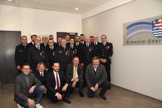 stehend von links: Stefan Soose, Markus Wiederhold, Thomas Dempwolf, Dirk Friedrich, Stadtbrandinspektor Borken Alexander Wilhelm, Reinhardt Müller, Andre Korell, Holger Raude, Stadtbrandinspektor Niedenstein Jan Hohmann, Frank Riebeling, Karsten Lipphardt, Jan Pfennig, Matthias Deusen, Stellv. Stadtbrandinspektor Niedenstein Stefan Berndt, Lars Pfennig, Gemeindebrandinspektor Willingshausen Ralf Lipphardt knieend von links: Bürgermeister Borken Marcel Pritsch, Kreisbrandinspektorin Tanja Dittmar, Bürgermeister Willingshausen Luca Fritsch, Landrat Winfried Becker, Bürgermeister Niedenstein Frank Grunewald