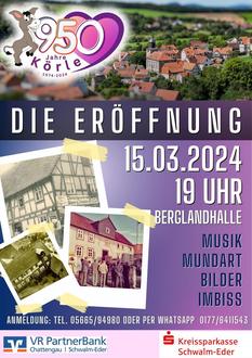 Mit Musik, Mundart und einem historischen Bildervortrag startet die Gemeinde Körle am Freitag, 15. März ins Jubiläumsjahr. Ab 19 Uhr findet die Eröffnungsveranstaltung der 950-Jahrfeier in der Berglandhalle statt. Die Besucher erwartet ein abwechslungsreiches Programm. Zu Gast sein wird Ralf Löber aus Büchenwerra, der „uff Pladde“ so einiges zum Besten geben wird. Bürgermeister Mario Gerhold entführt die Zuschauer mit zahlreichen historischen Aufnahmen auf eine Reise durch die Körler Geschichte. Für die musikalische Unterhaltung werden an diesem Abend das Ahle Blech sowie der Gesangverein sorgen.