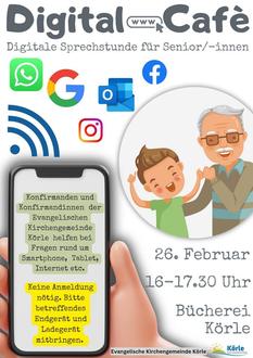 Das Körler Digitalcafé geht in die zweite Runde: Die Gemeinde Körle bietet in Zusammenarbeit mit der Evangelischen Kirchengemeinde am Mittwoch, 26. Februar, von 16 bis 17.30 Uhr Hilfe rund um Smartphone, Tablet, Internet und Co an. In der Gemeindebücherei an der Nürnberger Straße stehen Konfirmandinnen und Konfirmanden für Fragen zur Bedienung von digitalen Geräten mit Rat und Tat zur Seite.