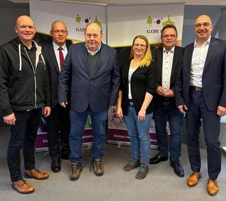 Stefan Wimmel (Geschäftsführender Gesellschafter u. Kaufmännischer Leiter Kleine Riesen Nordhessen), Vize-Landrat Jürgen Kaufmann, Kreistagsvorsitzender Michael Kreutzmann, Katharina Griesel (Referentin Fundraising und Unternehmenskommunikation Kleine Riesen Nordhessen), Landrat Winfried Becker und Michael von Bredow (Vorstand der Kreissparkasse Schwalm-Eder) (Bildautor: Stephan Bürger | Kreisverwaltung Schwalm-Eder)