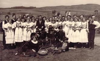 Diese Fotografie entstand 1950 in Mardorf im Kontext des Iglauer Brauches des Maibaumfällens (Fotografie: Archiv Franz Höfer)