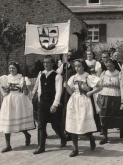 Zur Erinnerung an die alte Heimat und in Verbundenheit mit ihr spielten die Iglauer Trachten eine ganz besondere Rolle, so auch im Jahr 1954 bei einem Auftritt der Iglauer Jugendgruppe in Ziegenhain auf der Salatkirmes (Fotografie: Archiv Hans Maschita)