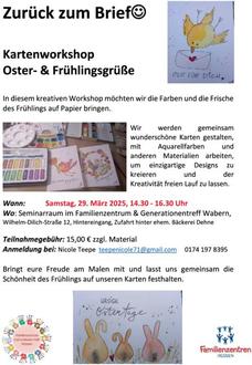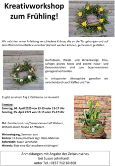 Wenn Sie ebenfalls eine Idee haben, was Sie im Familienzentrum & Generationentreff anbieten können, freuen wir uns auf Ihren Anruf 05683/5009-35 oder eine email an familienzentrum@wabern.de.