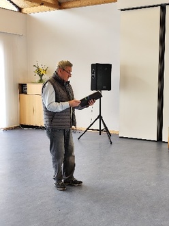 Lektor Norbert Martin, in Begleitung am Piano mit Marga Claus, boten den religiösen Teil des Nachmittags. In seiner Andacht beleuchtete er die Wichtigkeit des Wassers, das für alle Menschen immer von großem Nutzen war und auch immer sein wird als wesentlicher Bestandteil der Existenz des Menschen. Gemeinsam sangen die Zuhörerinnen und Zuhörer einige Kirchenlieder.