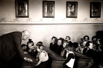 Erster Schultag 1937, Hauptlehrer Valentin Weidemann mit seinen Schülern (Fotografie: Archiv Familie Laabs)