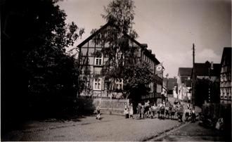 Das im Jahr 1970 abgerissene Gebäude der Waberner Volksschule hinter der Kirche (Fritzlarer Straße) mit Schülern im Jahr 1940 (Fotografie: Archiv Familie Laabs)