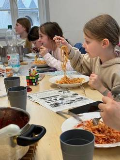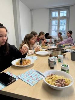 Beginnend ein Rezept auszusuchen, den Einkauf abzuwickeln und dann die Zutaten in etwas Essbares zu verwandeln. Jeder hat sich eine Aufgabe gesucht und gemeinsam wurde eine schöne kleine Mahlzeit gekocht.