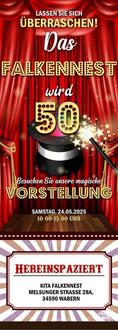 Wir, die KiTa FalkenNest feiern am 24.05.2025 von 10-15 Uhr unser 50 jähriges Jubiläum und laden Sie herzlich dazu ein, dieses besondere Ereignis mit uns gemeinsam zu feiern. Für das leibliche Wohl wird an diesem Tag mit leckeren Bratwürstchen, Grillkäse und später auch mit Kaffee und Kuchen gesorgt. Außerdem besucht uns Herr Bressan mit seinem Eiswagen. Unter unserem Partythema „Zirkus“ wird es eine große Show mit verschiedenen Auftritten und unter anderem einem Besuch von einem Zauberer geben. Lassen Sie sich überraschen!