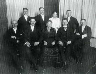 Familie Vogel ca. 1914, von links nach rechts: Abraham, Max, Julius (?), Moritz, Mutter Sara, Clara, Siegmund, Leopold, Isaak (?) (Fotografie: Archiv Thomas Schattner)