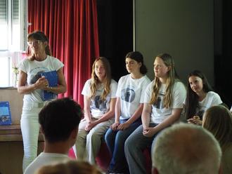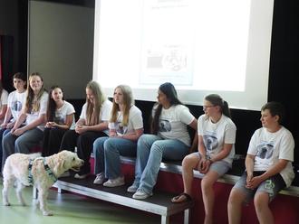 Abends am 3. Juli 2025 um 17:30 Uhr war es endlich so weit. Die Schülerinnen und Schüler des 4 Paws Clubs präsentierten einem gespannten Publikum ihr erstes selbstgeschriebenes und selbstgestaltetes Buch „Sternchenaugen – The Big 4 Paws Club’s Adventure“ im Theaterraum der GHS. Das Buch wurde in einem Schreibprojekt unter der Federführung Frau Hembds (Lehrkraft der GHS) entwickelt ... und auch Buddy, die Schulhündin der GHS, war da.