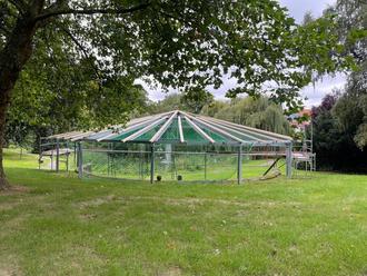 Die Arbeiten an der neuen Überdachung des Rondells im Park Falkenberg schreiten sichtbar voran. Nachdem es zu Beginn des Bauvorhabens aufgrund unerwarteter Gründungsverhältnisse und notwendiger Umplanungen zu deutlichen Verzögerungen kam, können wir nun erfreuliche Entwicklungen vermelden.