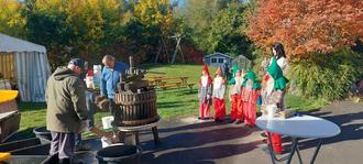 im Freien, bzw. bei Regen natürlich wieder in der Feuerwehrgarage. Ab 10.00 Uhr beginnt der Aufbau und die Vorbereitung der über einhundert Jahre alten Holzkelter. Im Saal des Dorfgemeinschaftshauses und im Außengelände rund um das DGH führen Künstler und Handwerker aus der ländlichen Umgebung ihr Können vor. Vom Herstellen von Holzdekorationen über Selbstgenähtes, gestrickte Socken, bis hin zu handgearbeiteten Bienenwachskerzen und Schmuck, sowie ländlichen Küchenspezialitäten wird ein abwechslungsreiches Programm geboten. Ab Mittag werden deftige Suppe und grobe Bratwürste vom Holzkohlengrill serviert. Im Wintergarten des DGH bieten die "Landfrauen“ zum Kaffee den berühmten und stets beliebten selbstgebackenen Kuchen an. Der frisch gepresste Saft wird direkt zum Trinken verkauft oder kann in mitgebrachte Gefäße gefüllt werden. Und für alle, die auf Cola, Bier und andere Getränke hoffen, ist natürlich auch